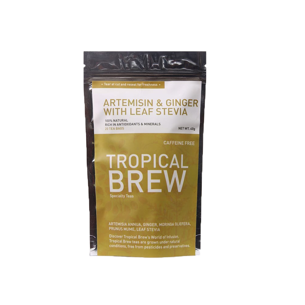 Tropical Brew Artemisin tea is made with a combination of naturally grown complementary ingredients to boost the immune system and relieve symptoms of fever, inflammation and helps to clear the gut. It promotes general wellness that helps to keep away infections and supports good nutrition. Sweetened with a hint of leaf stevia for a superb palatable taste without added calories.